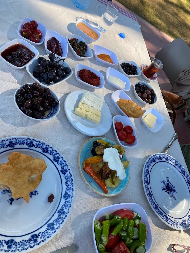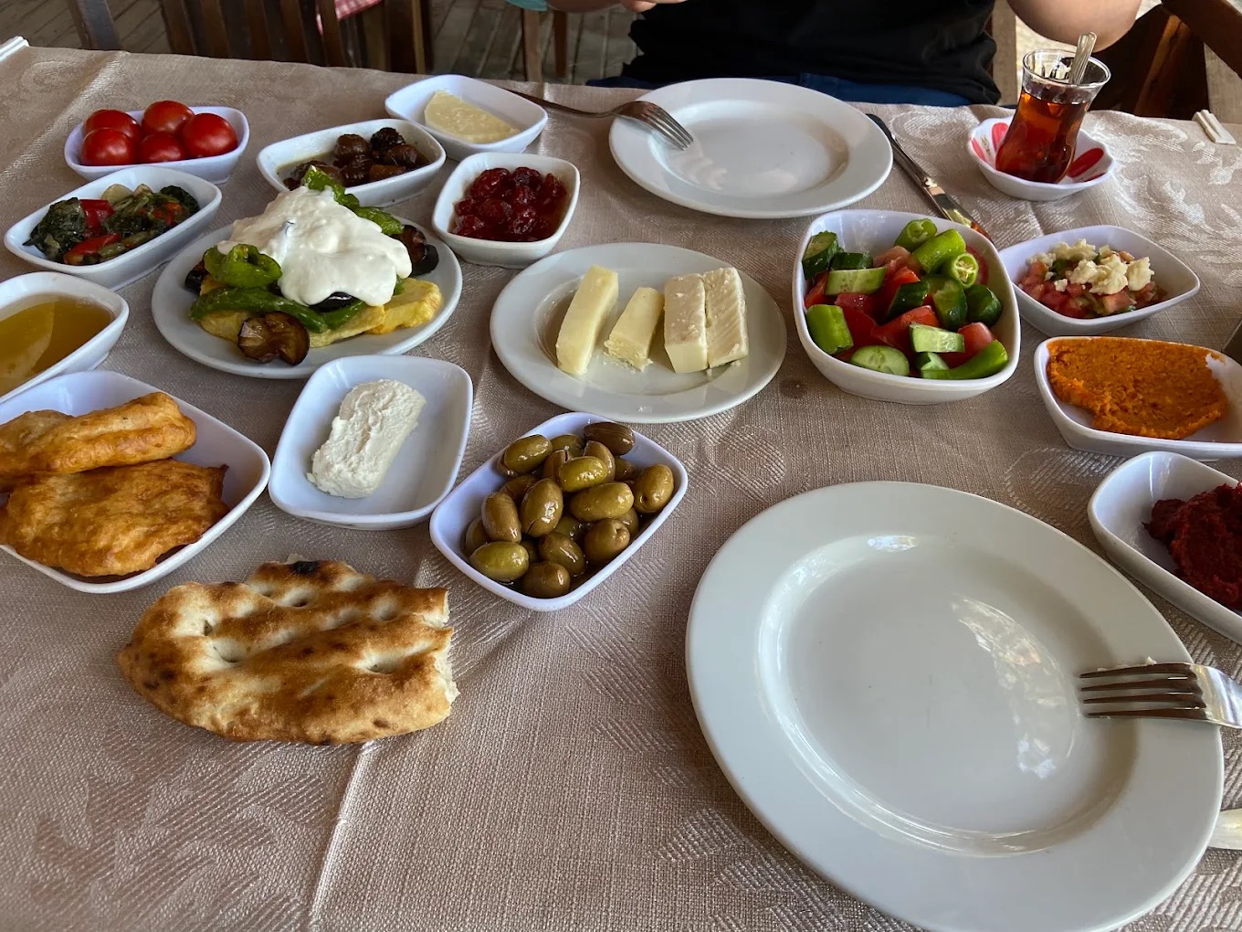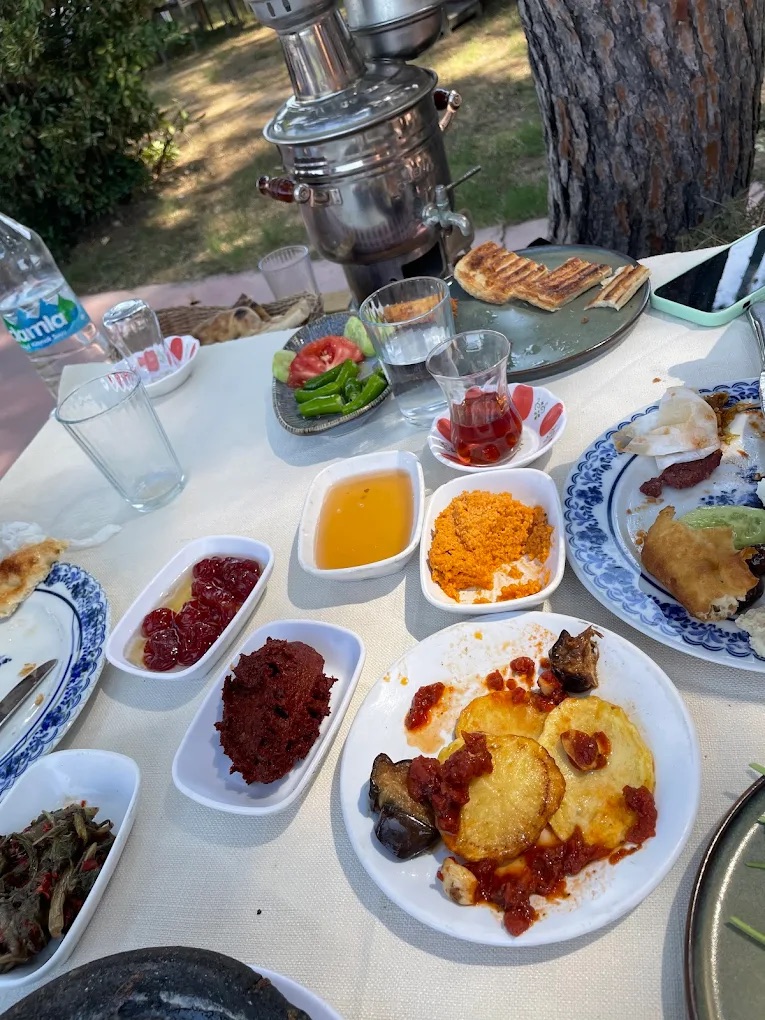 Dağ manzarasında köy kahvaltısı sunuyor. Ağaçlar arasında doğal ortamda organik serpme kahvaltı.
