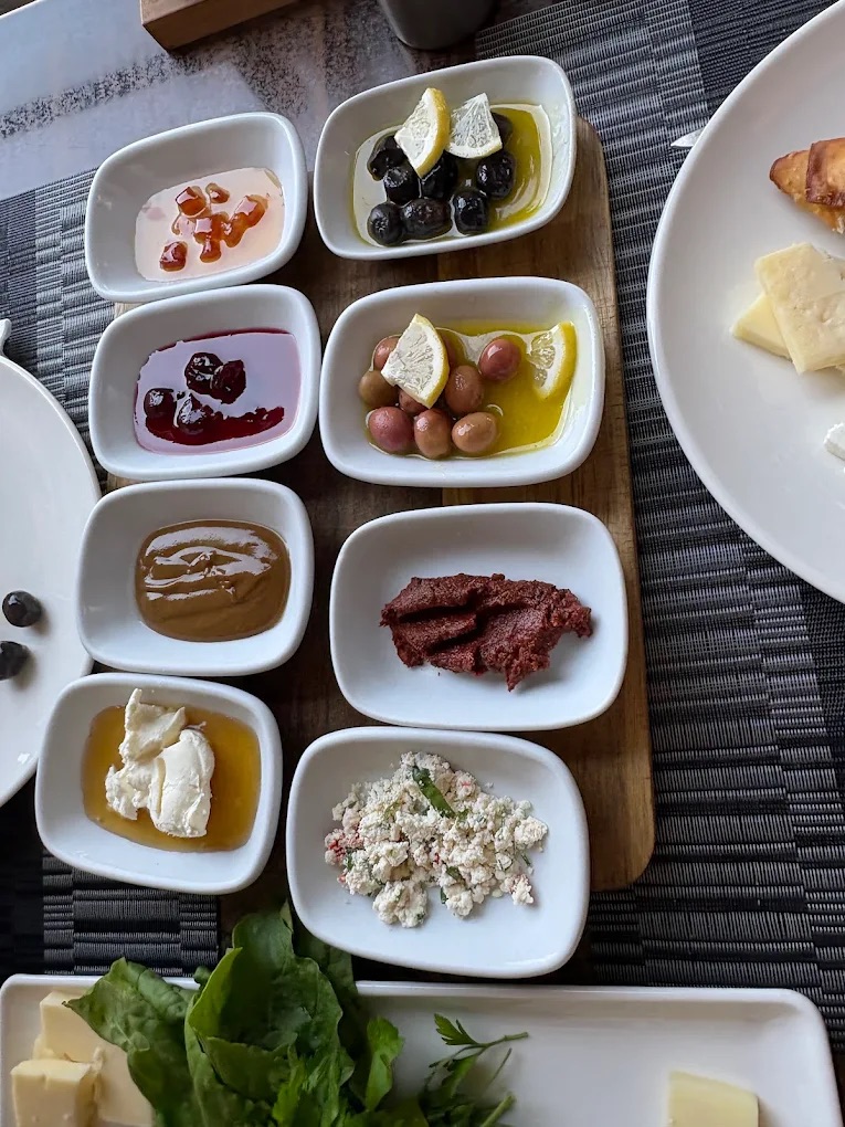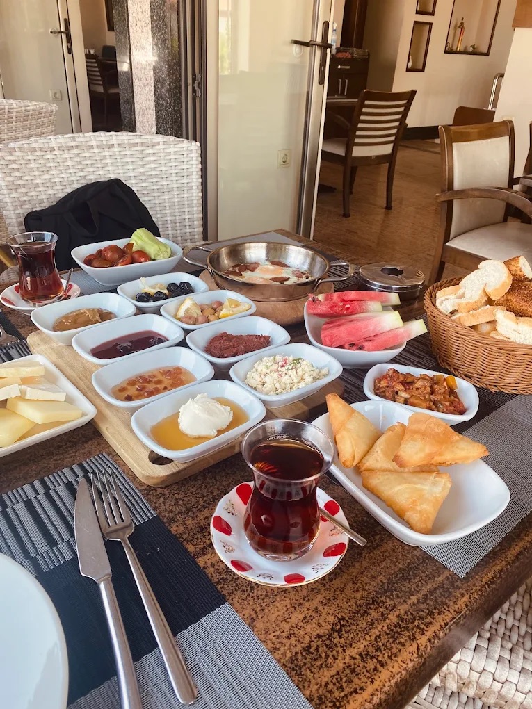 Deniz manzarasında serpme kahvaltı sunuyor.